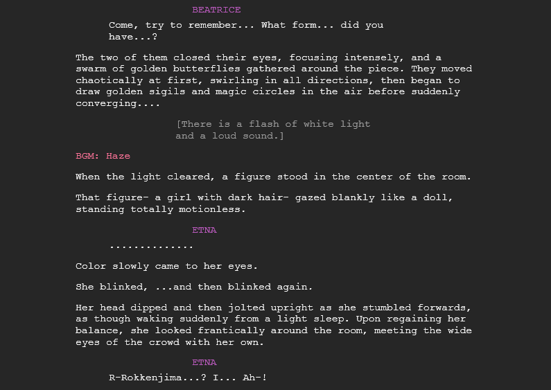 While putting my first example scenes together, I quickly realized this, and that these factors made heavily editing the raw screenplay (which I had mostly finished drafting by that point) a total waste of time. Beyond making sure things lined up in the big picture — themes, plot threads and the like, which were already mostly-solved problems as a result of working closely to a pre-written outline — worrying about the minutiae of moment-to-moment pacing or awkward phrasing was totally pointless, because every single line in the screenplay would have to be heavily edited or outright rewritten to fit alongside the rest of the visual novel presentation.